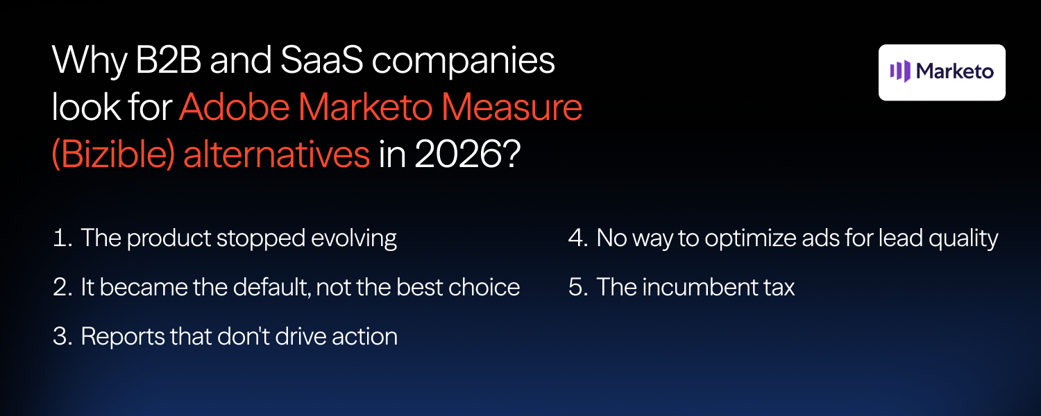 This guide compares all 10 Marketo Measure alternatives on attribution methodology, CRM compatibility, optimization capabilities, and pricing — addressing the gaps that push B2B teams away from Bizible. For a broader view of the B2B attribution landscape, see 6 Best B2B Marketing Attribution Tools in 2026.